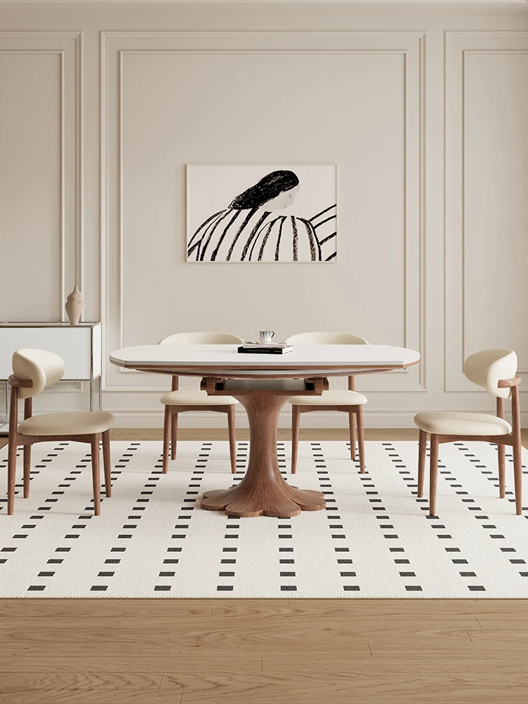 伸縮式デリフォン岩板ダイニングテーブル - 小型スペースに最適!フレンチクリーム風の折りたたみ可能な円形テーブルで、四角形にも変形可能。おしゃれで実用的な中古風デザインで、家族や友人との食事を楽しむのにぴったり!