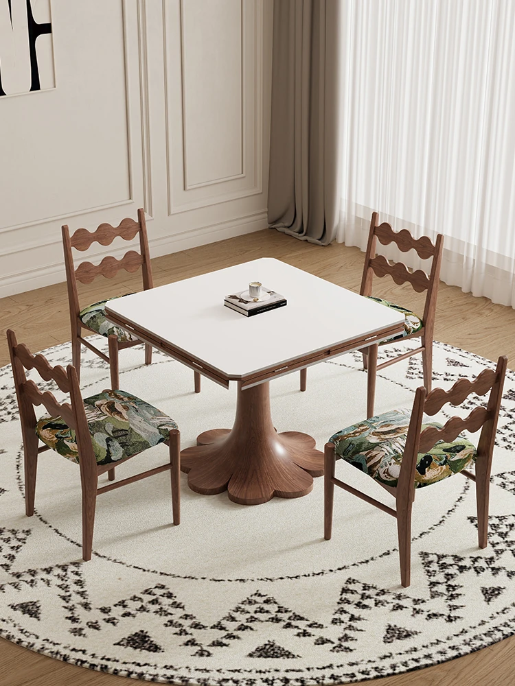 折りたたみ式正方形デリフォン無垢材ロックプレートダイニングテーブル - フレンチクリームスタイルのコンパクト設計、小型住宅にも最適な伸縮可能な食卓!おしゃれで実用的な空間を演出します。