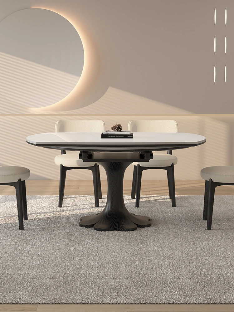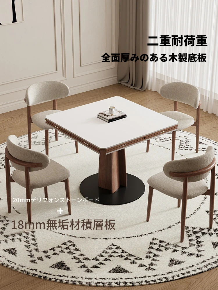 デリフォンの無垢材ロックプレートダイニングテーブル、伸縮可能なクリーム色のヴィンテージスタイル、高級感あふれる四角形と円形の両用デザイン、家族や友人との素敵な食卓を演出します。