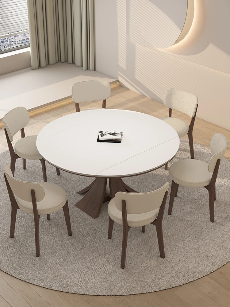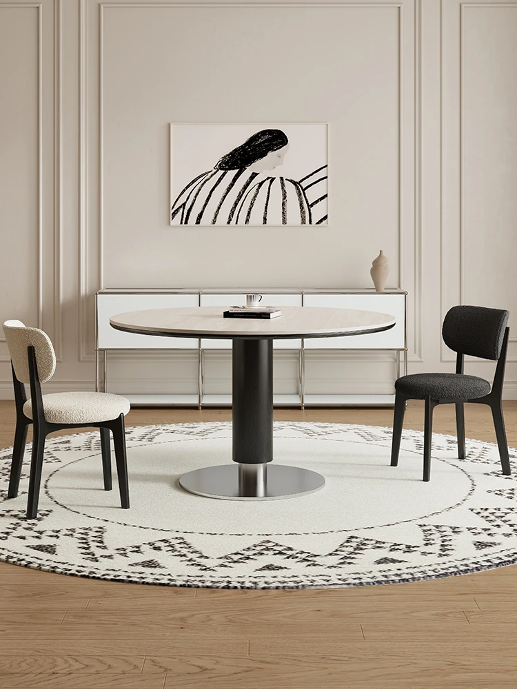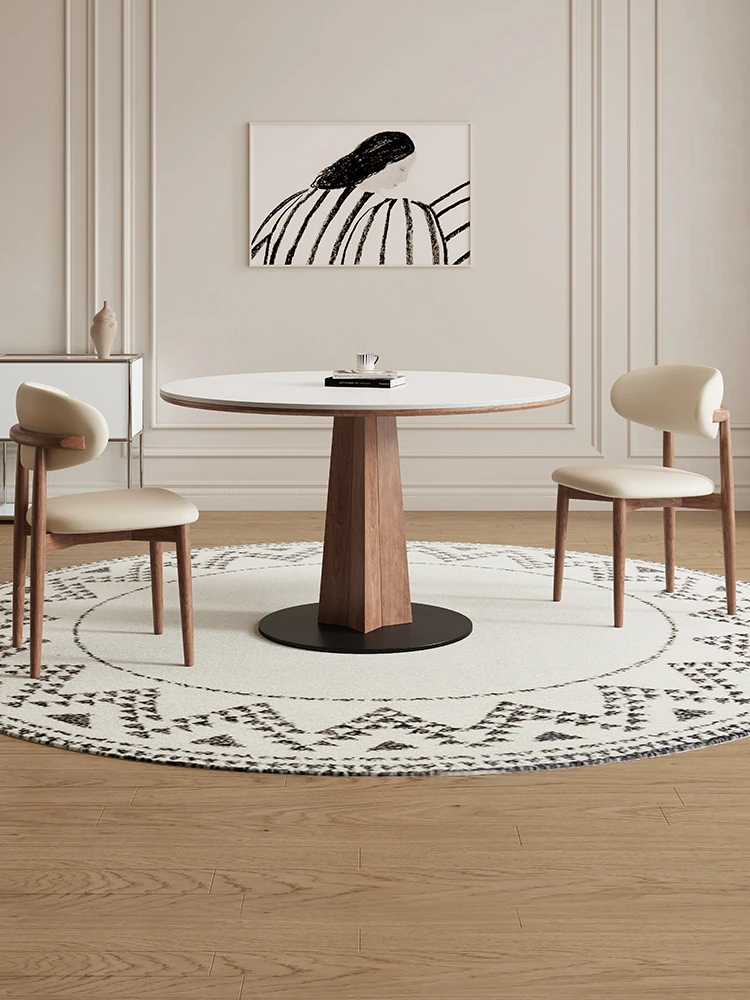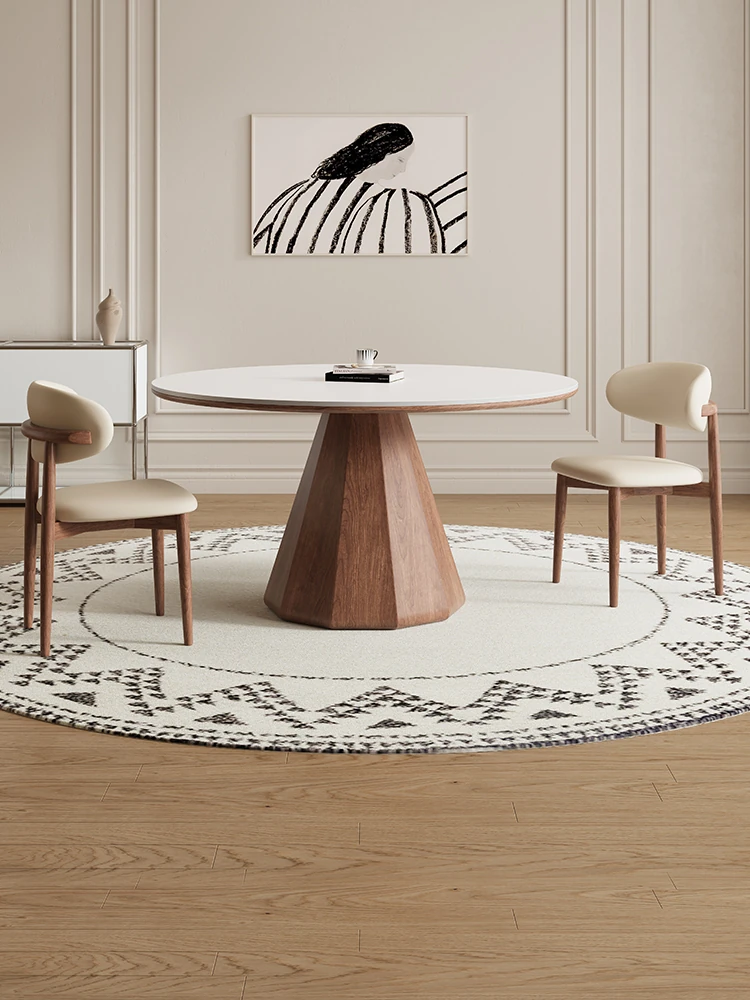 デリフォン 高級無垢材ロックプレート円形ダイニングテーブル - 小スペースに最適!フランス風クリーム色のヴィンテージデザイン、エレガントな雰囲気を演出。家族団らんにぴったりの全自動円卓。