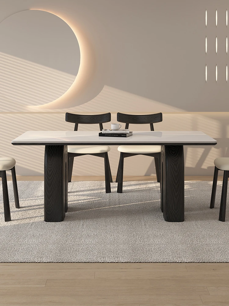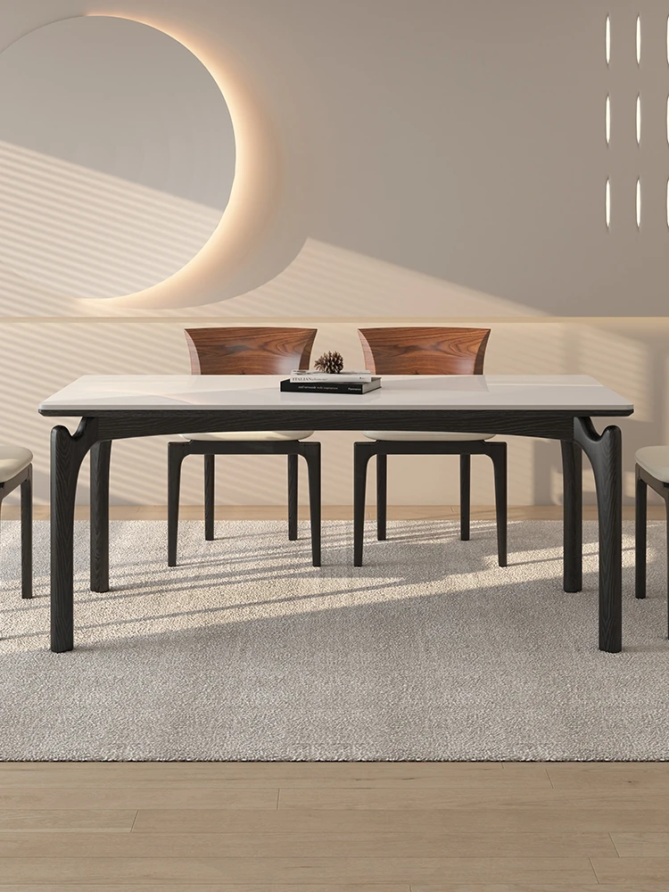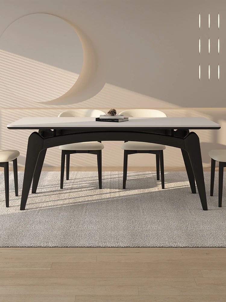 デリフォン無垢材ロックボードダイニングテーブル - コンパクトな小型住宅にぴったりの侘寂スタイル、クリーミーなミッドセンチュリー風の長方形ブラックテーブルで、食事をより特別なひとときに!