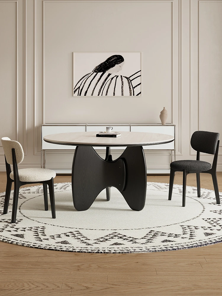 デリフォン高級無垢材ロックボードダイニングテーブル - ブラック、フレンチクリームスタイルのヴィンテージ感あふれる小型ラウンドテーブル。おしゃれでコンパクトな家用テーブル、スペースを有効活用!