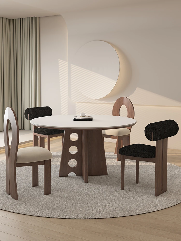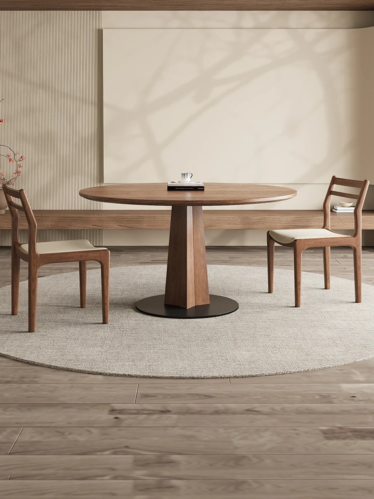 高級感溢れる無垢材の円形ダイニングテーブル - 新中式デザインで小さなお部屋にもぴったり!クリーム色のヴィンテージ風仕上げ、ウォールナットカラーでおしゃれな食卓に。