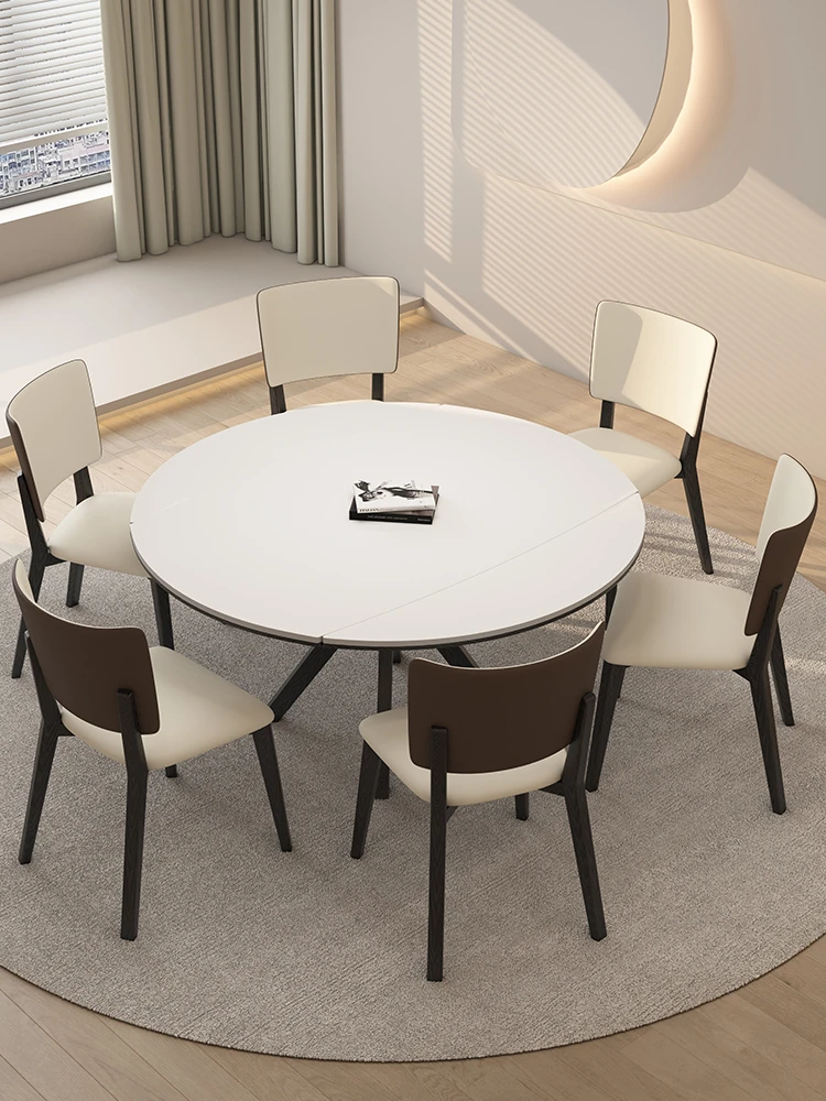 伸縮可能な無垢材ロックボードダイニングテーブル - 家庭用コンパクトデザイン、クリーミーなヴィンテージ風、四角と丸の両方に対応、折りたたみ式でスペースを有効活用!